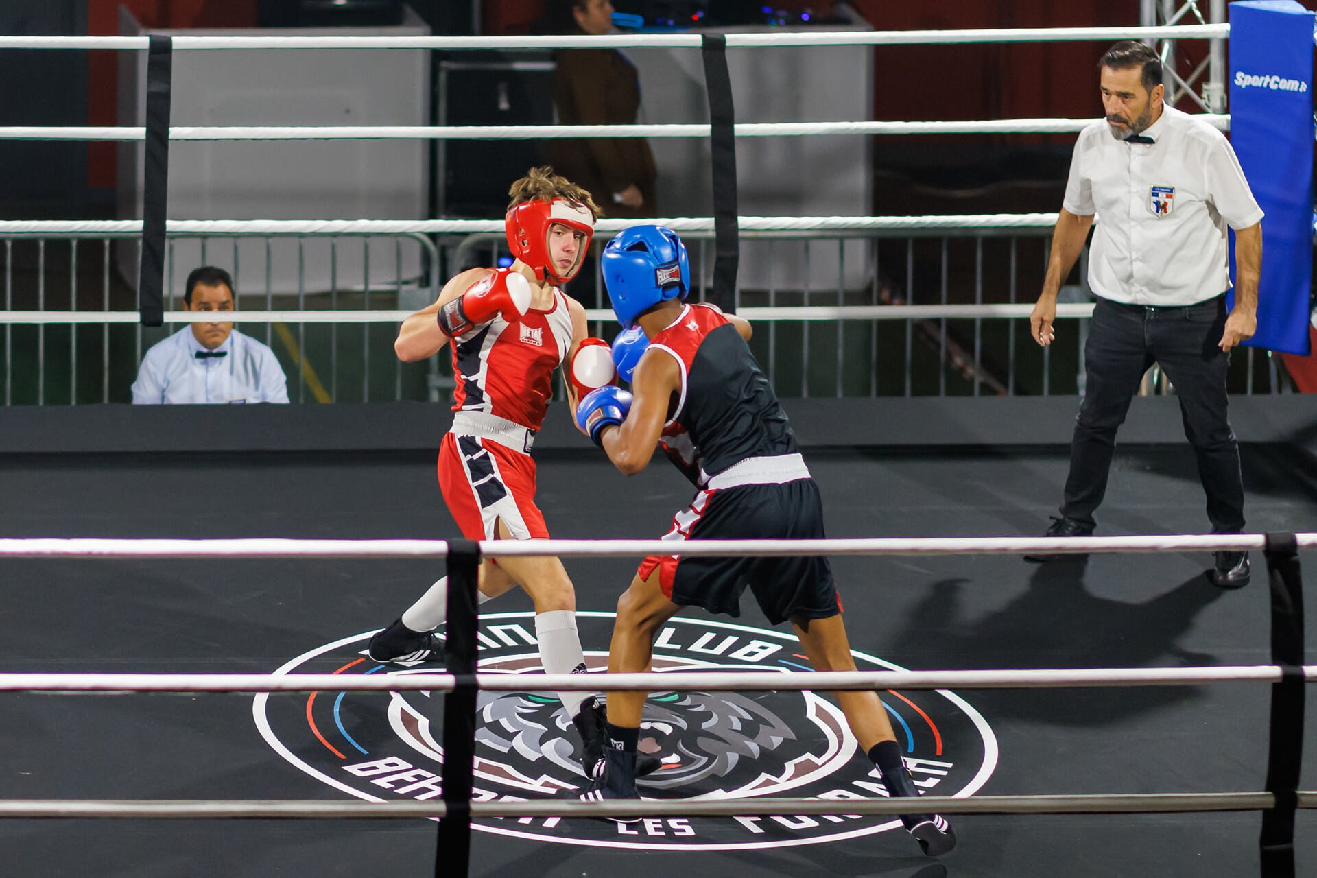 - Ce casque de boxe est disponible en rouge et en bleu.