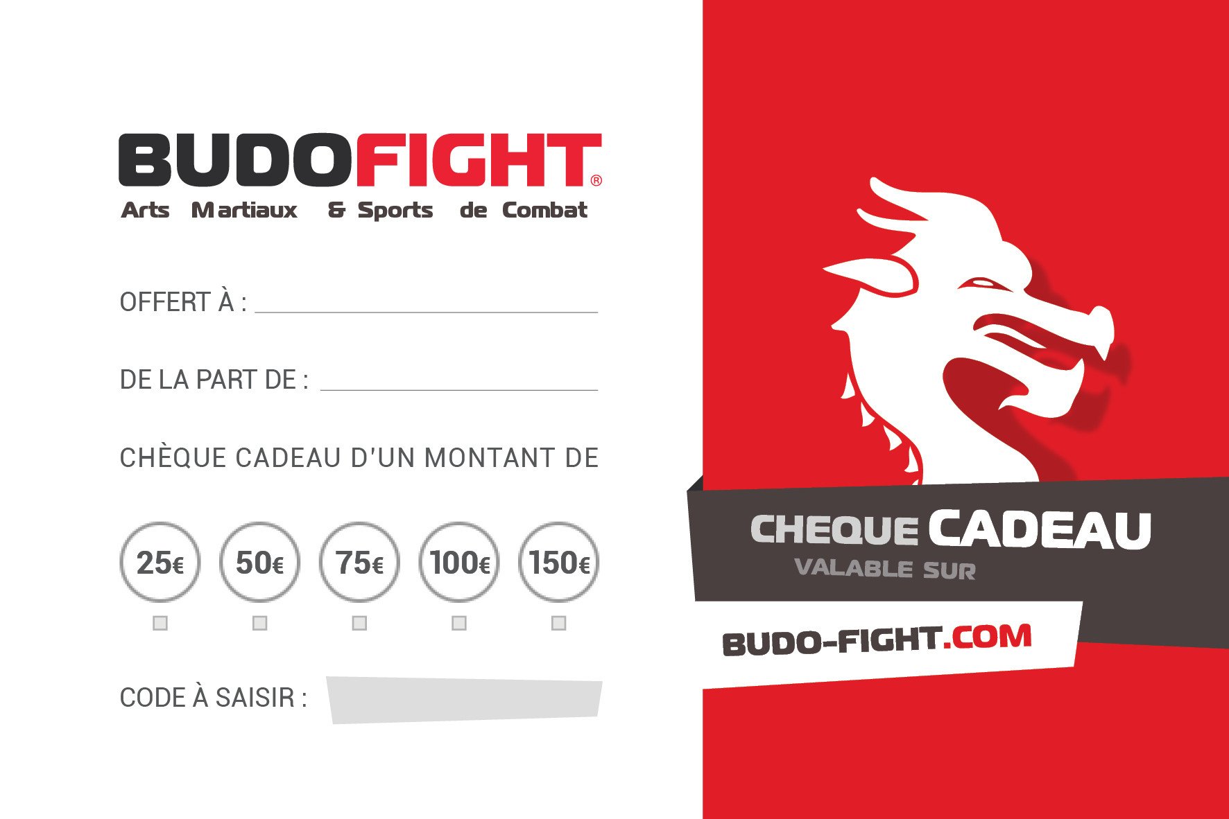 Avec un montant de 25€ à 150€, les chèques cadeaux Budo-Fight sont valables sur tous les produits de notre boutique en ligne d'arts martiaux et de sports de combats. Judo, boxe anglaise ou française, karaté, MMA ou encore fitness... Il y en a vraiment pour tous les goûts !