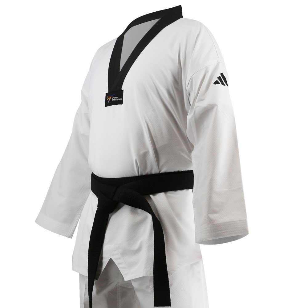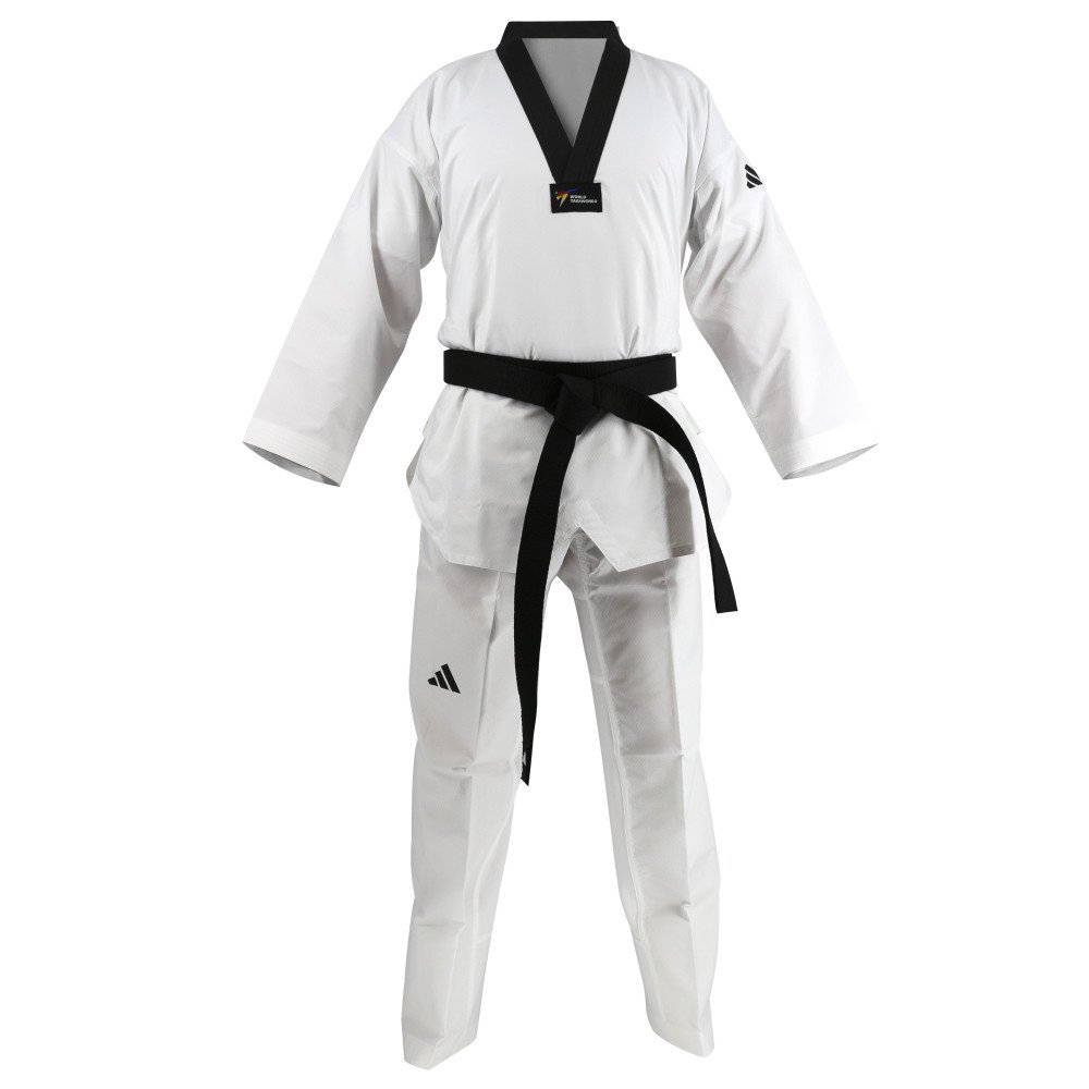 Fabriqué à partir d'un tissu mélangé de coton (55%) & polyester (45%) au toucher tissé et strié, le dobok de taekwondo Adi-Champion II d'Adidas à col noir est particulièrement agréable à porter. Approuvé par la WTF, Il est notamment recommandé pour la compétition.