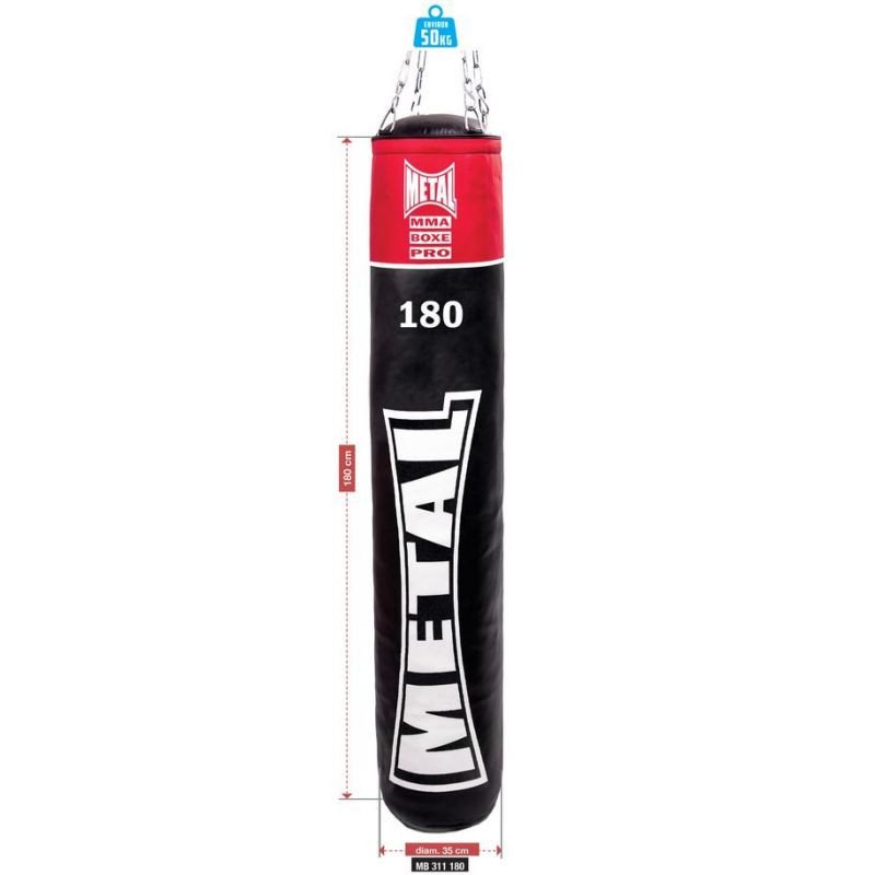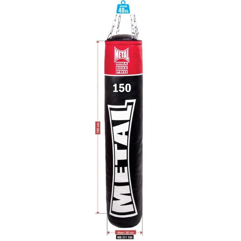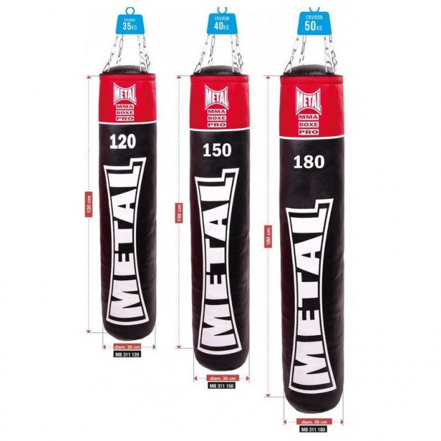 Ce sac de frappe Metal Boxe est disponible en plusieurs poids et dimensions : 120 cm (35 kg), 150 cm (40 kg) ou 180 cm (50 kg). Si vous le souhaitez, ce sac de frappe est également disponible en version vide.