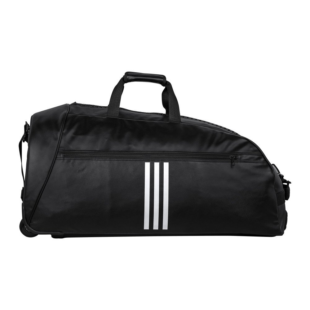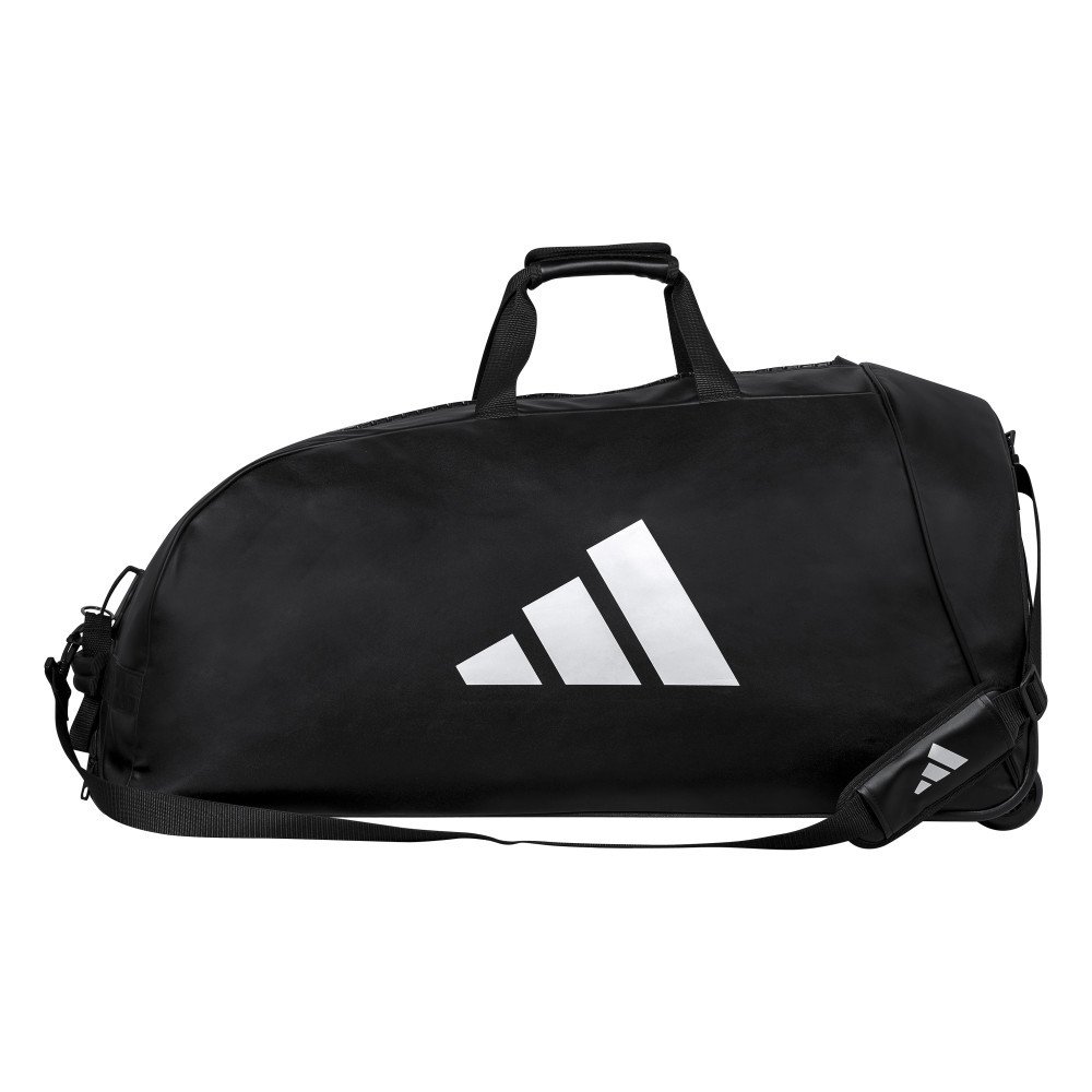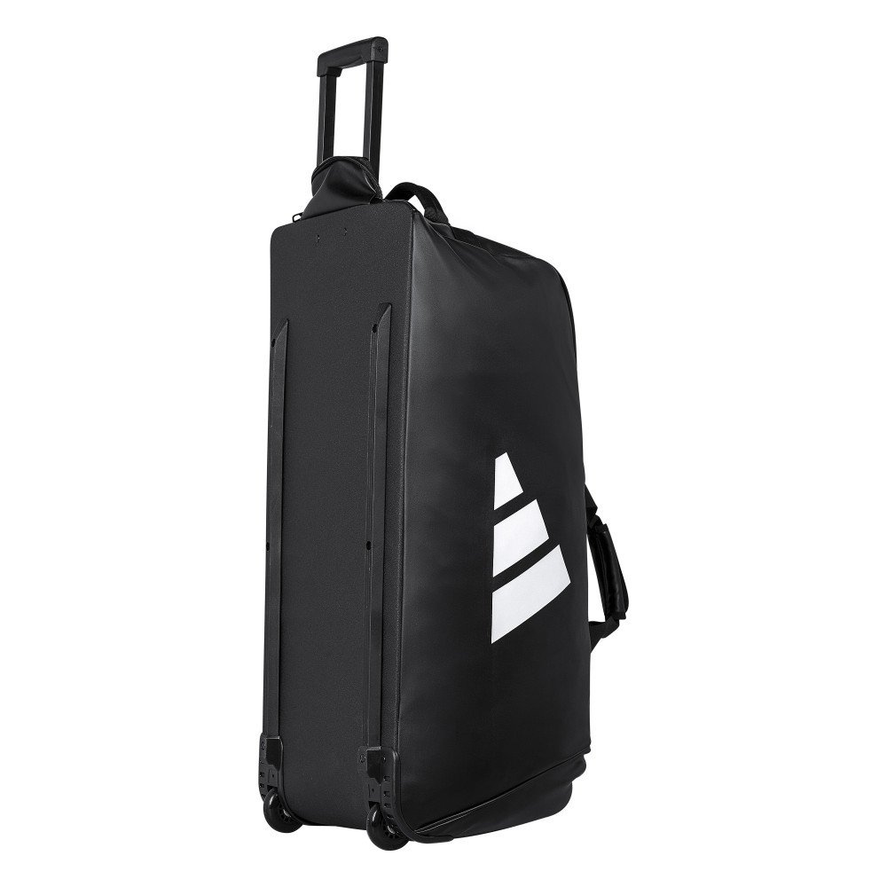 Le sac de sport à roulettes Adidas est de couleur noire, avec logo Adidas Sports de combat sur le côté.