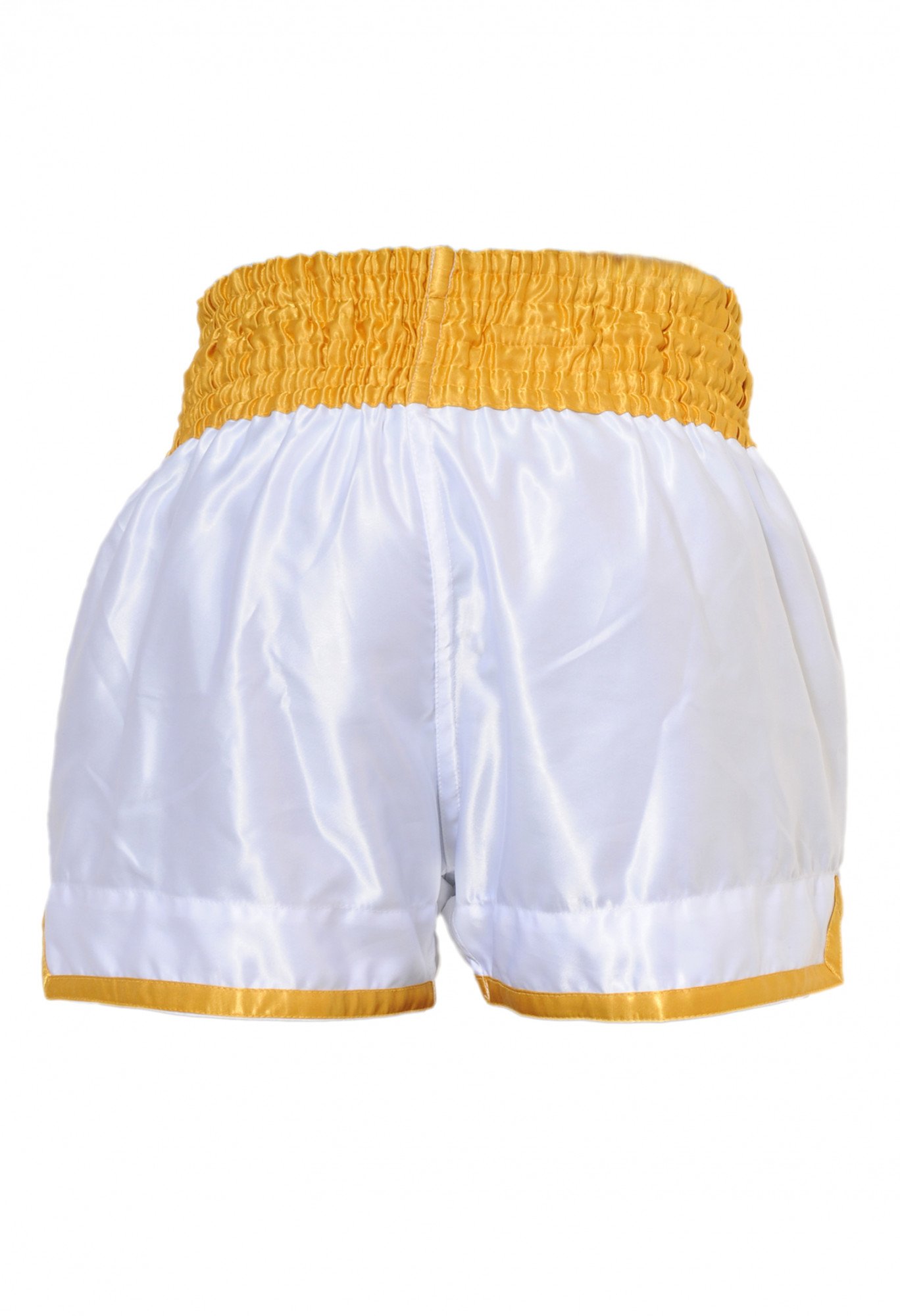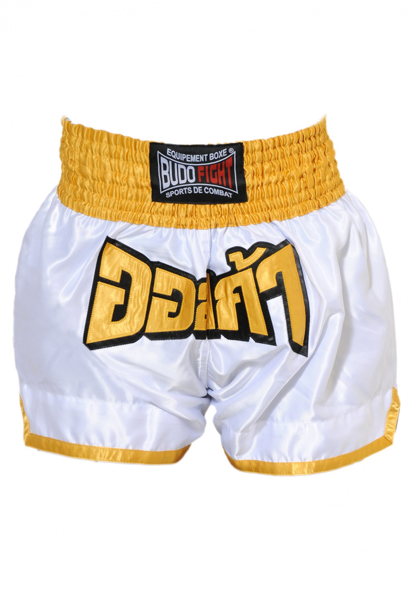 Découvrez ce short de boxe thaï Fighter blanc & jaune par Budo-Fight : un textile de boxe à l'aspect satiné, à la fois confortable, léger et résistant.