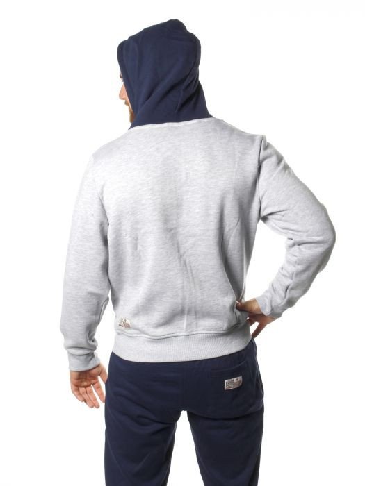 - Son design est très classique : des impressions bleu foncé sur un fond gris chiné. La capuche est de la même couleur que les impressions pour contraster avec le reste.