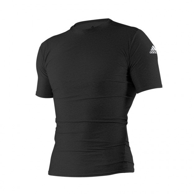 Découvrez le t-shirt en lycra noir Adidas à manches courtes, le rashguard confortable qu'il vous faut pour vos entrainements. Le t-shirt taille petit ! Optez pour une taille au-dessus de votre taille habituelle.