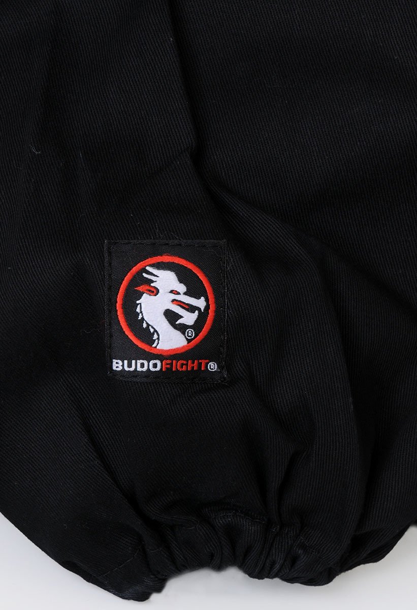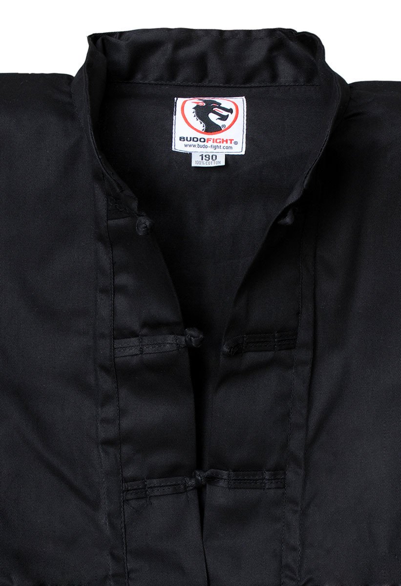 Ce zhuang noir se compose d'une veste manches longues à col chinois, fermée par 7 boucles croisées. Un petit écusson Budo-Fight est également présent sur la veste.
